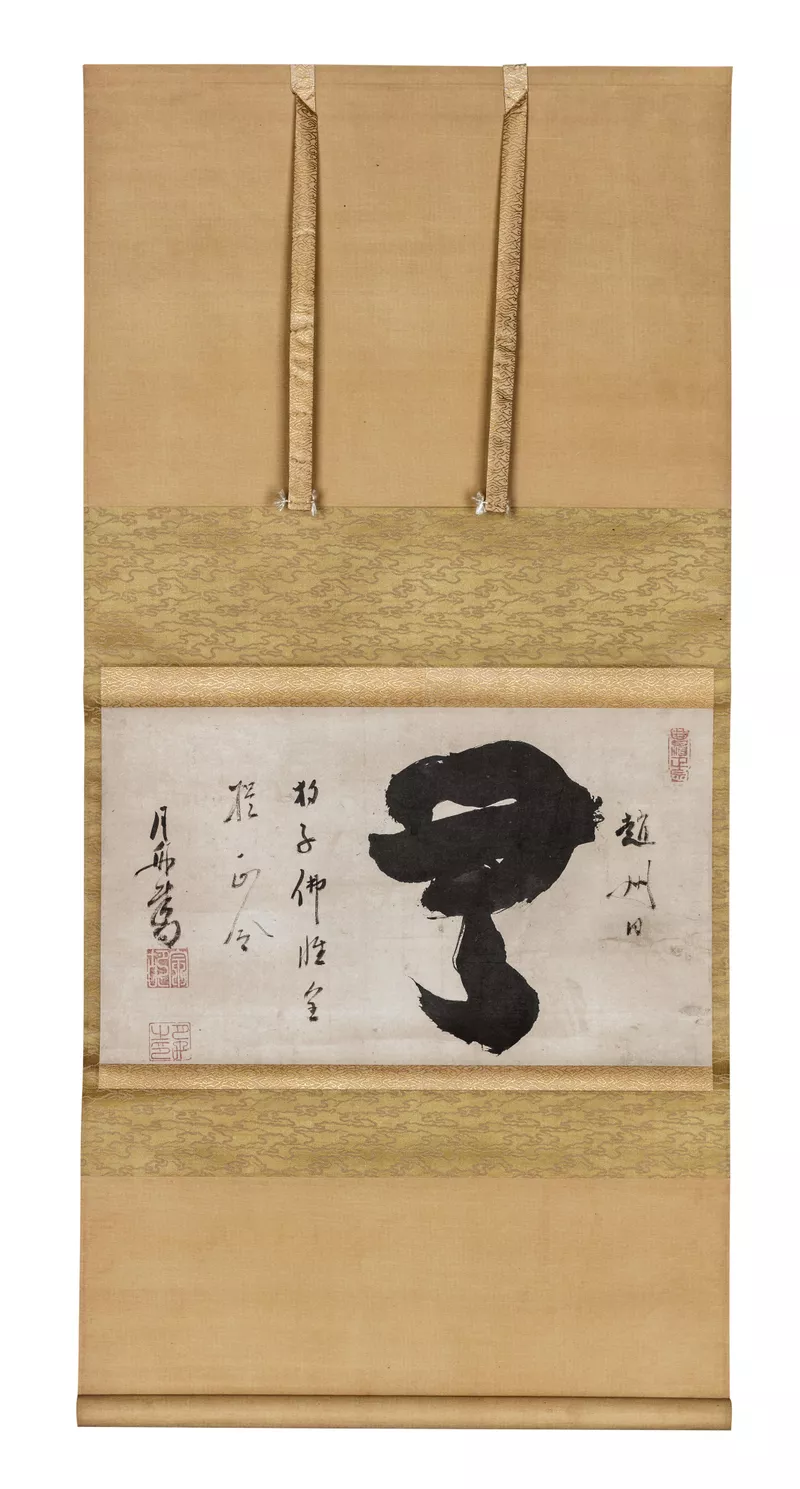 Nothingness (mu) was created c.1650 by Gesshū Sōko (1618– 1696). Gesshū is known as the ‘revitaliser’ of the Soto school of Zen Buddhism and this work demonstrates his particular style. Gesshū has chosen to emphasise the (calligraphic) character for emptiness or nothingness (mu) and reduced it to an abstract character, quickly written in three brushstrokes. Mu refers to a mind that is not fixed or occupied by rational thought or emotion and thus open to all possibilities, including enlightenment. According to his biography, Gesshū Sōko was so engrossed by this concept that while sitting in an outhouse he lost track of time and place and was abruptly ‘awoken’ by the thunderous crash of the door. The diminutive characters on the left and right make reference to a prominent koan, known as ‘Joshu’s dog’ and recorded in the Zen classic, The Gateless Gate (c.13th century). According to the text, the Chinese master, Zhàozhōu Cōngshěn (778–897), was asked by a monk: ‘Has a dog the buddha nature or not?’ He replied: ‘mu’. The seeming ridiculous response is in keeping with the aim of the koan, which is to foster focused meditation in order to transcend the bounds of the rational mind.