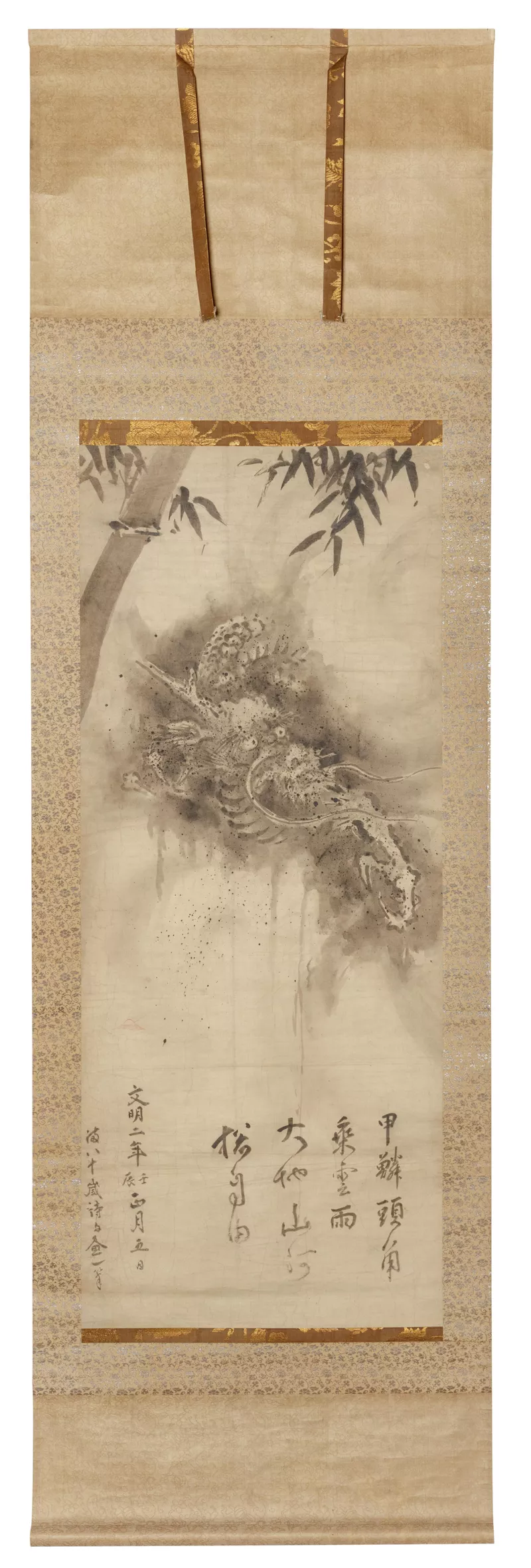 As an artist trained in the longest surviving and most influential school of painting in Japan, Kan ō Tan’yu had an acute understanding of his artistic lineage, as well as of the history of art. Dragon and bamboo includes an intriguing inscription, dating the painting to the ‘second year of Bunmei [1468], fourth month, fifth day; poem and painting by the pen of an eighty-year-old’. This seems to be a homage to the great Japanese master of brush and ink, Sesshū Tōyō (1420–1596), and may point to Kanō Tan’yu as an avid collector and historian of Chinese and Japanese brush and ink.
