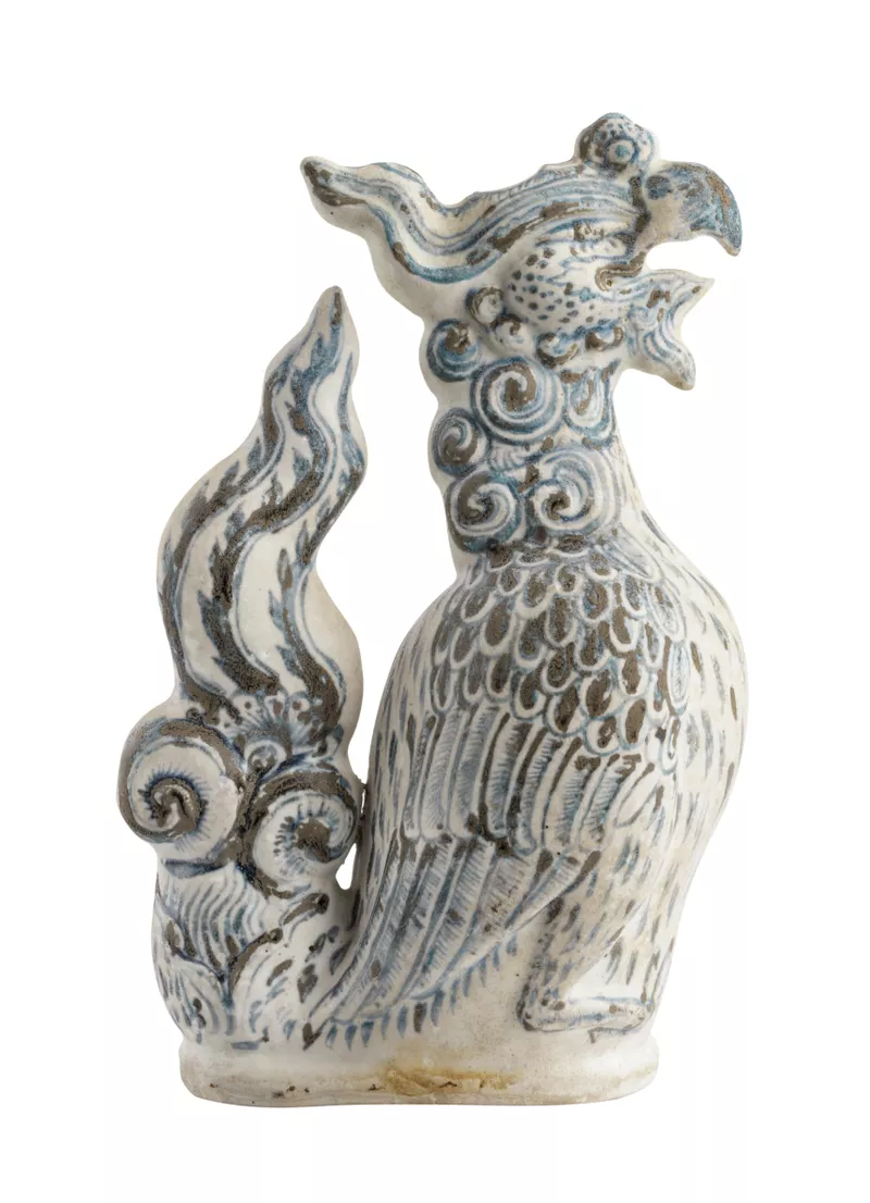 The phoenix in Vietnamese belief is often paired with the dragon. Pouring vessels in the shape of a naga dragon, and similar in dimensions to the Ewer, were also salvaged from the same wreck site and it is possible that the two types of vessels were originally conceived as pairs. The comparatively small group of ceramics in the shape of various animals found at the Cu Lao Cham site suggests that Ewer was a luxury item intended for the upper end of the market. Perhaps the item was part of an Indonesian order, as historical evidence confirms the practice of Javanese courts specifically ordering purpose-made ceramics from the Vietnamese kilns.
