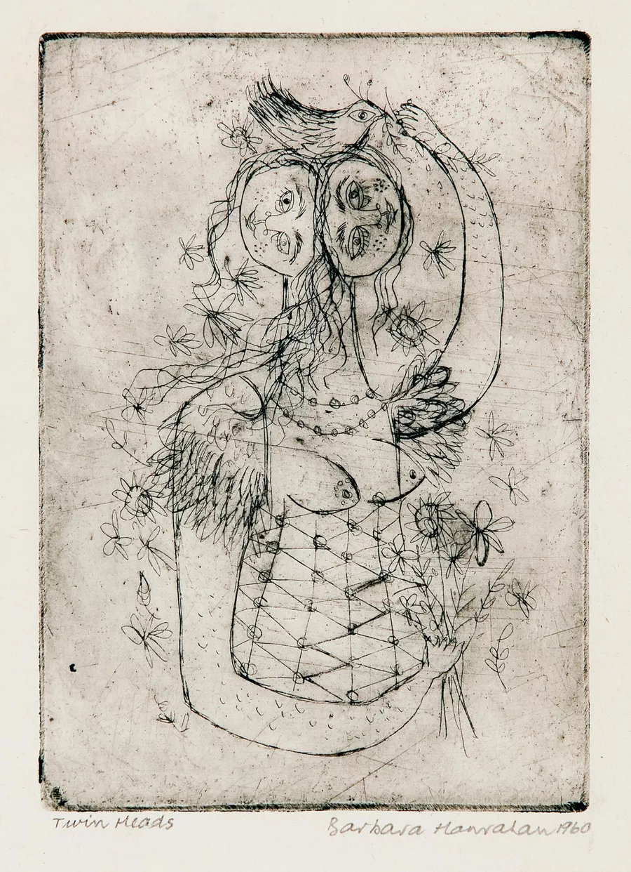Barbara Hanrahan, born Adelaide 1939, died Adelaide 1991, Twin heads, 1960, Adelaide, drypoint on paper, 15.5 x 11.0 cm (plate), 23.3 x 15.0 cm (sheet); Gift of Barbara Hanrahan 1990, Art Gallery of South Australia, Adelaide, Courtesy estate of the artist.
