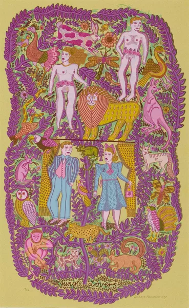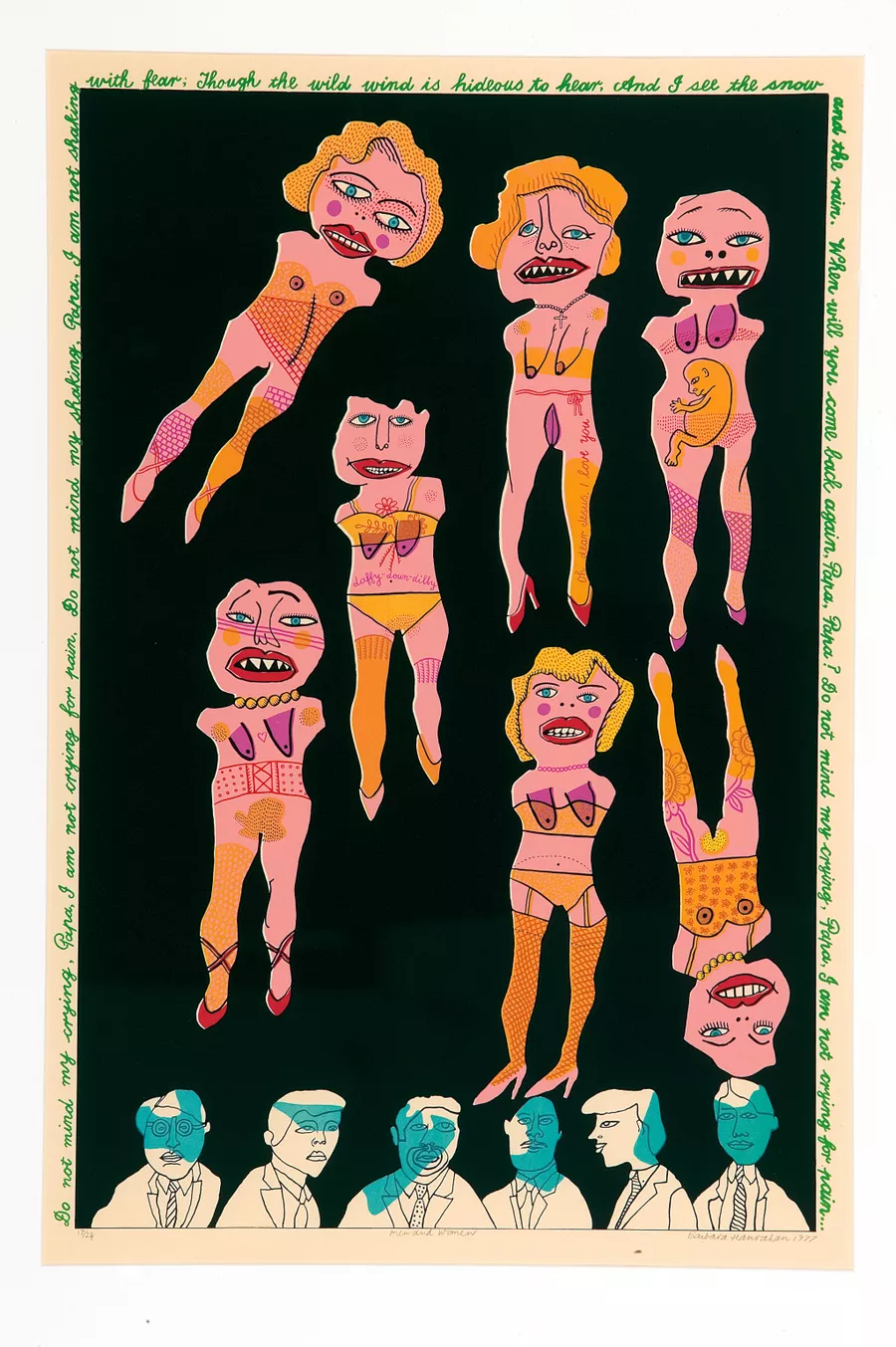 Barbara Hanrahan, born Adelaide 1939, died Adelaide 1991, Men and Women, 1977, London, colour screenprint on cream paper, 65.0 x 44.0 cm (image), 79.5 x 57.0 cm (sheet); Gift of Jo Steele 1998, Art Gallery of South Australia, Adelaide, Courtesy estate of the artist.