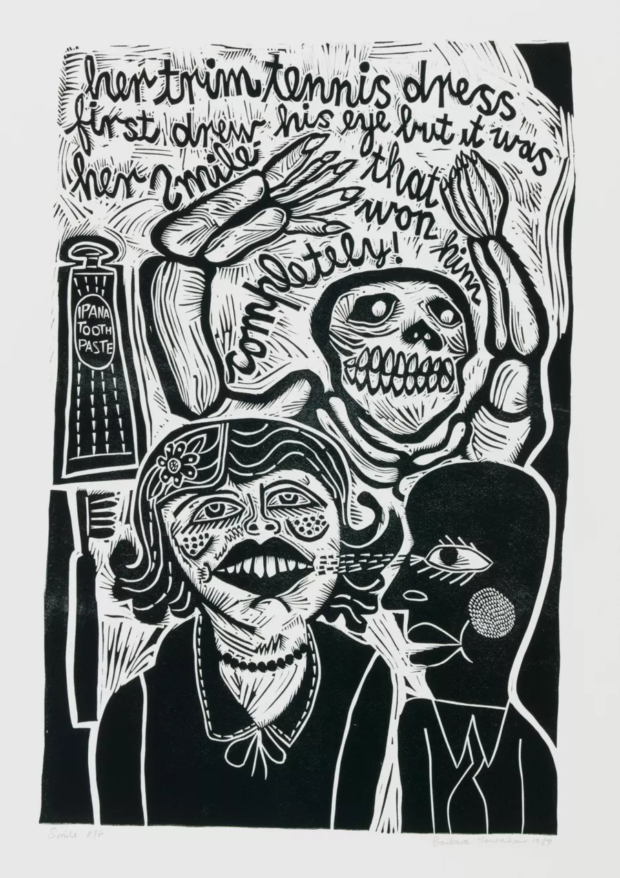 Barbara Hanrahan, born Adelaide 1939, died Adelaide 1991, Smile, 1987, Adelaide, linocut on paper, 54.8 x 36.6 cm (image), 79.5 x 56.5 cm (sheet); Gift of Jo Steele 1998, Art Gallery of South Australia, Adelaide, Courtesy estate of the artist.