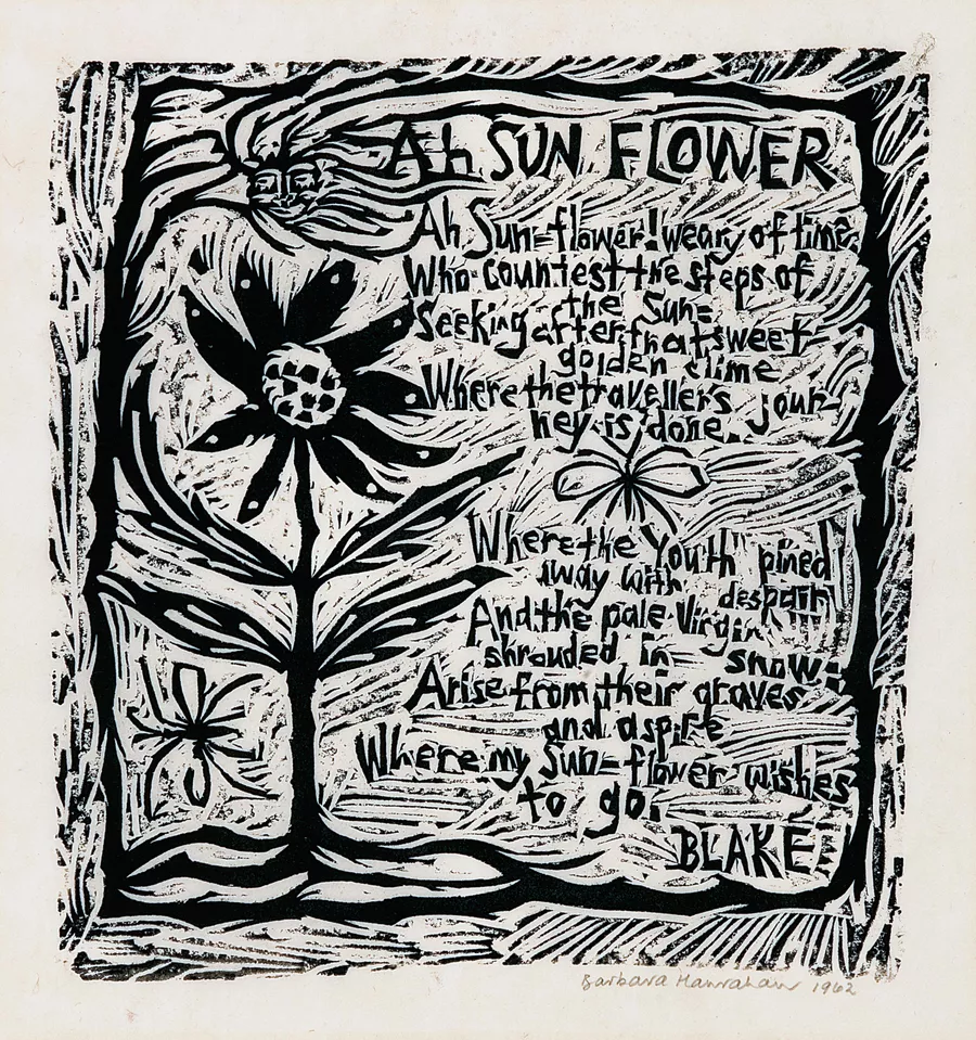 They are striking original prints which convey the vitality of the natural world. In Ah, Sunflower…, 1962 the leaves and roots of the sunflower extend as though in an embrace, while the hatching creates a web of lines that expresses the dense hum of a garden – of flowers, insects and other living things.