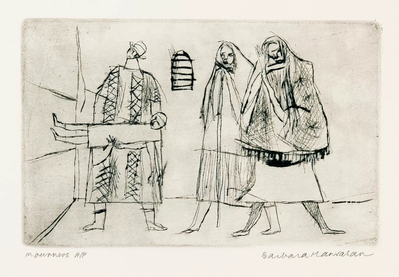 Barbara Hanrahan, born Adelaide 1939, died Adelaide 1991, Mourners, 1961-62; printed 1989, Adelaide, drypoint on paper, 13.7 x 21.5 cm (plate), 27.8 x 34.9 cm (sheet); Gift of Barbara Hanrahan 1990, Art Gallery of South Australia, Adelaide, Courtesy estate of the artist.