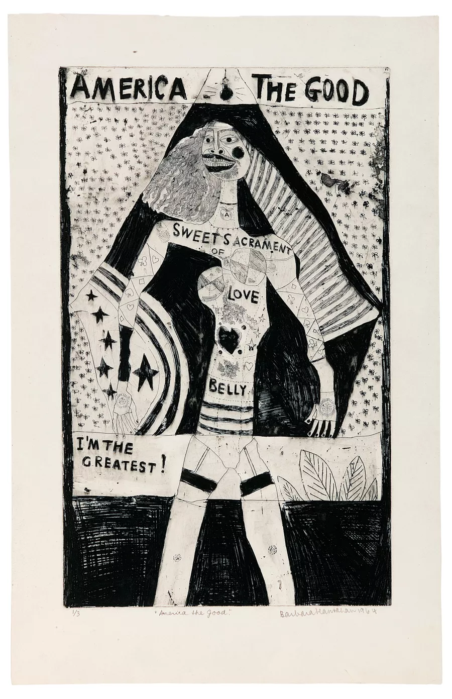 Barbara Hanrahan, born Adelaide 1939, died Adelaide 1991, America the good, 1964, London, etching on paper, 55.5 x 34.0 cm (plate), 68.5 x 44.0 cm (sheet); Gift of Jo Steele 1996, Art Gallery of South Australia, Adelaide, Courtesy estate of the artist.