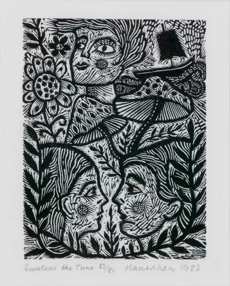 Before her departure for London in 1963, Hanrahan made a series of linocuts incorporating image and text. These were inspired by the visionary eighteenth-century British artist and writer, William Blake.