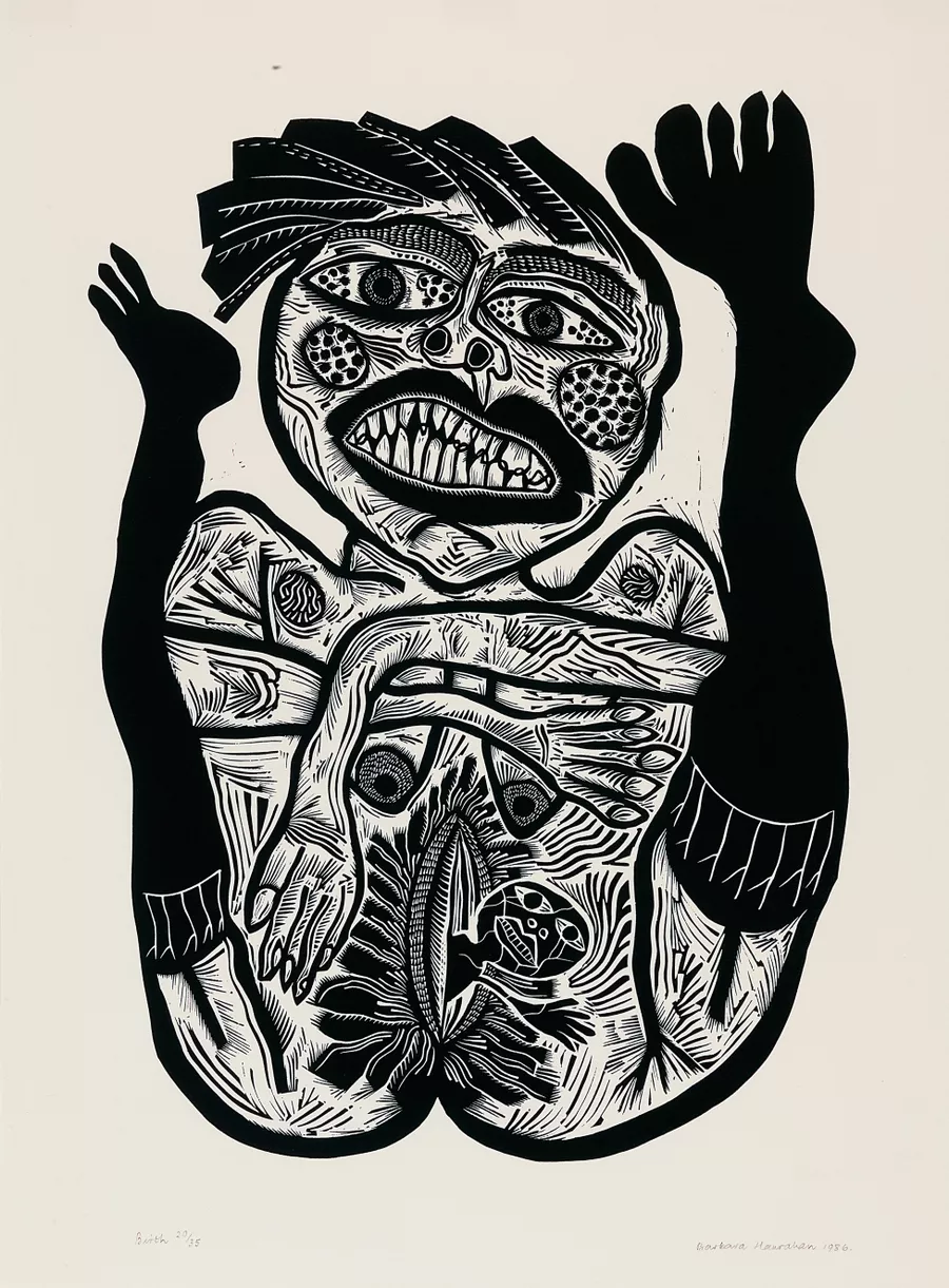 Barbara Hanrahan, born Adelaide 1939, died Adelaide 1991, Birth, 1986, Melbourne, linocut on paper, 56.3 x 38.5 cm (image), 70.5 x 49.8 cm (sheet); Gift of Jo Steele 1998, Art Gallery of South Australia, Adelaide, Courtesy estate of the artist.
