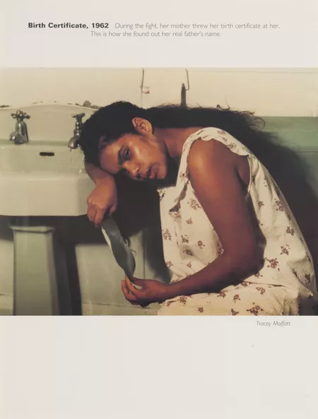 Frequently using herself as a model in highly staged photographs, Moffatt presents tableaux that explore the tensions underpinning unequal power dynamics. Moffatt’s first major photographic series, Something More, 1989, comprised eight large photographs that drew on the aesthetics of 1950s melodrama to tell the story of a young woman’s attempt to leave her small town life for the promise of the city. The series concludes with a violent death.