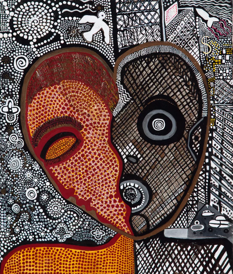 Brush with the Lore is a major work by pioneering Ngarrindjeri artist Trevor Nickolls, whose paintings offer sharp social commentaries on contemporary Aboriginal life.