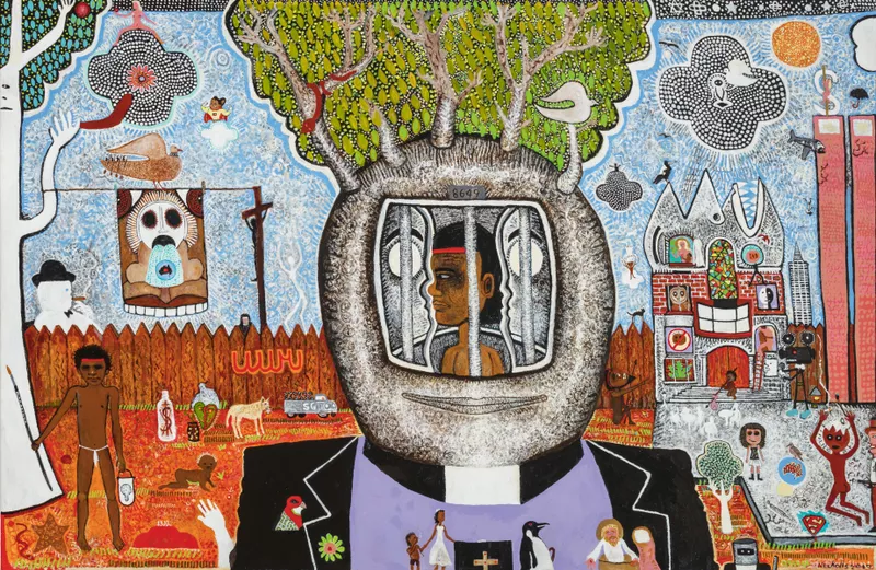 Brush with the Lore – painted in 2010, two years before the artist’s death – is composed as if the viewer is seated in a theatre, looking at a stage on which a busy and loaded scene unfolds. At its centre is a clerical figure whose head is a boab tree, inside which Nickolls has depicted himself imprisoned behind bars. Surrounding this are finely executed images that refer to the many different laws that Aboriginal people are required to navigate, the effects of enforced Western religion on the cultural beliefs of Aboriginal people, the Stolen Generations, atomic testing in South Australia and Aboriginal deaths in custody.