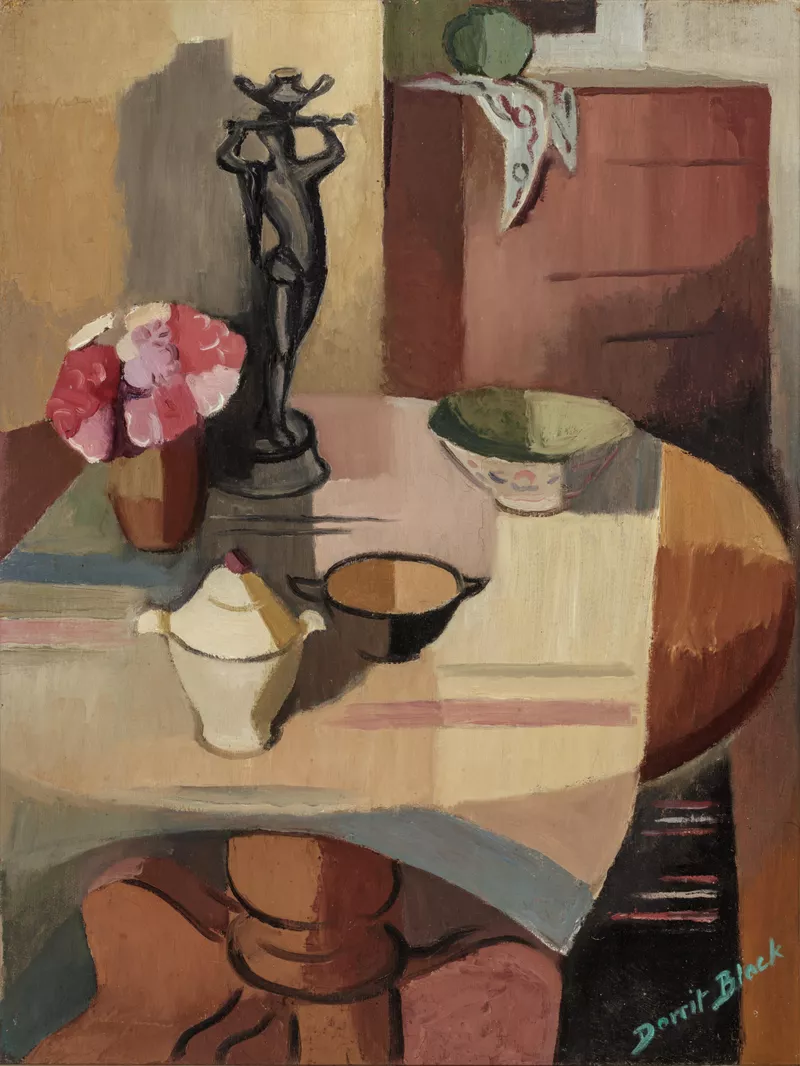 Still life – interior retains the formulaic studio cubism of her French teacher, André Lhote, yet the areas of modulated tone foreshadow the powerful modelling of solid forms that would develop in Black’s later still lifes. The intimacy and informality of this painting is a confident advance on the staged group studio exercises undertaken at the Parisian Académie Lhote in 1928 and 1929 and records Black’s own private realm, most likely her flat at Rose Bay, Sydney. Although cosy, the space is smart: the patterned floor rug, tablecloth and the ceramics all point to the modern avant-garde. The two ceramic bowls on the table top are particularly notable and are plausibly early French examples created by her artist friend, the celebrated modernist potter, Anne Dangar, possibly for Studio Primavera, Paris. At the time, Dorrit Black was informally working as the Sydney agent for Dangar’s ceramics. Dangar was by then creating pottery at the artists’ colony at Moly-Sabata, led by the renowned French cubist, Albert Gleizes.