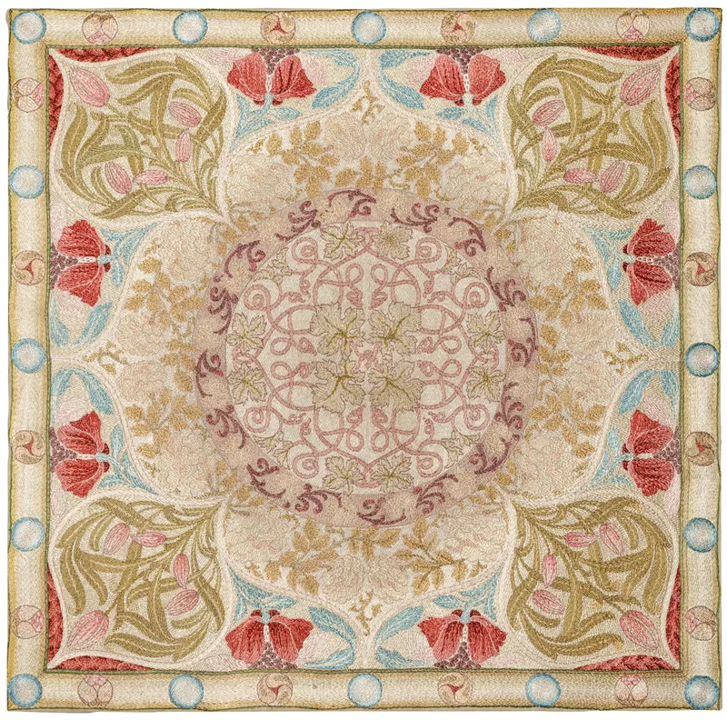 A pioneer of art embroidery, May Morris ran the embroidery department of Morris & Co. and was a successful designer of wallpaper, jewellery and woven textiles. As part of the firm’s range, May Morris designed embroidery kits, which were then sent from Britain to clients around the world. Each kit included a design marked in outline, accompanied by a small completed sample section, which indicated the stitching techniques and colours to be employed. It was a highly successful business model and the kits sold in great numbers. The four works acquired were embroidered from such kits by the Barr Smiths’ daughter, Erlistoun, in Adelaide. The designs could also be purchased ‘complete’ for a higher fee, although Erlistoun enjoyed stitching the works herself, reflecting the arts and crafts philosophy of workers taking pleasure in making items by hand.