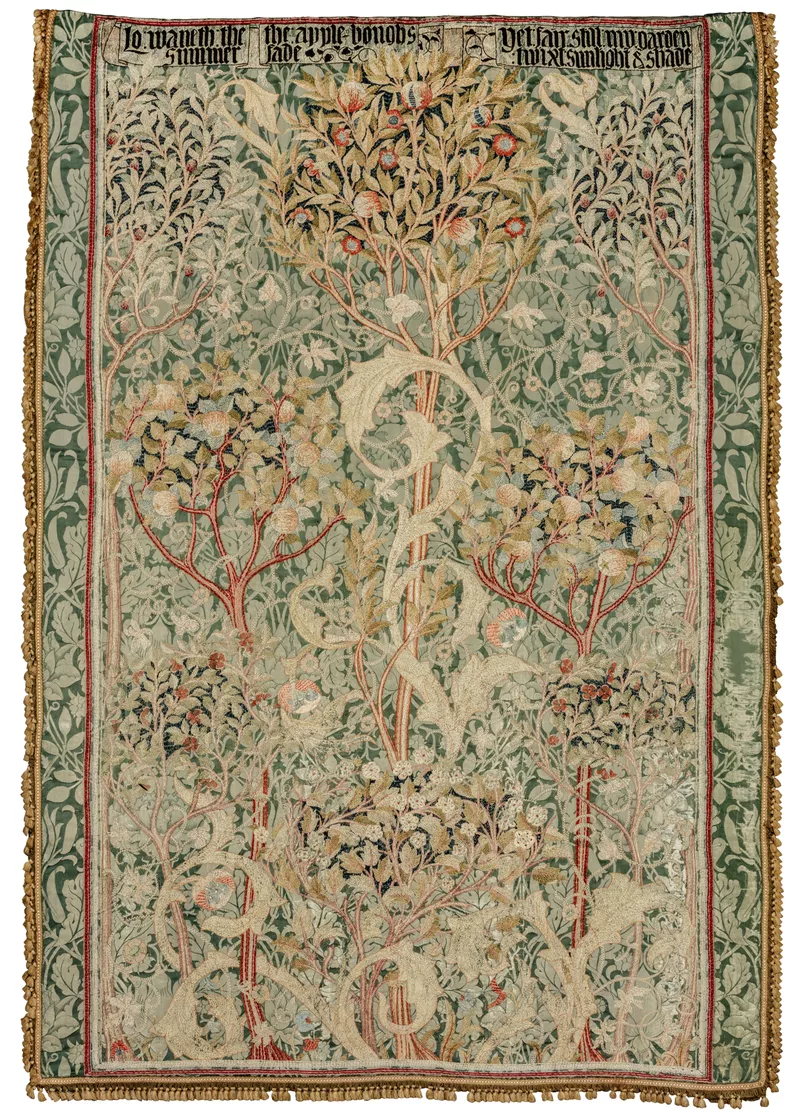 Fruit garden portière contains an orchard of flowering and fruiting trees arranged on the surface and connected by vine tendrils, with the background Oak fabric visible behind the design. Fruit garden, also known as Orchard, is regarded as one of May Morris’s most outstanding designs. She exhibited a version of it at the 1890 Arts and Crafts exhibition in London. A portière is a hanging curtain placed over a door or over the doorless entrance to a room, its name derived from the French word for door, porte. This work is currently on display in gallery 18.