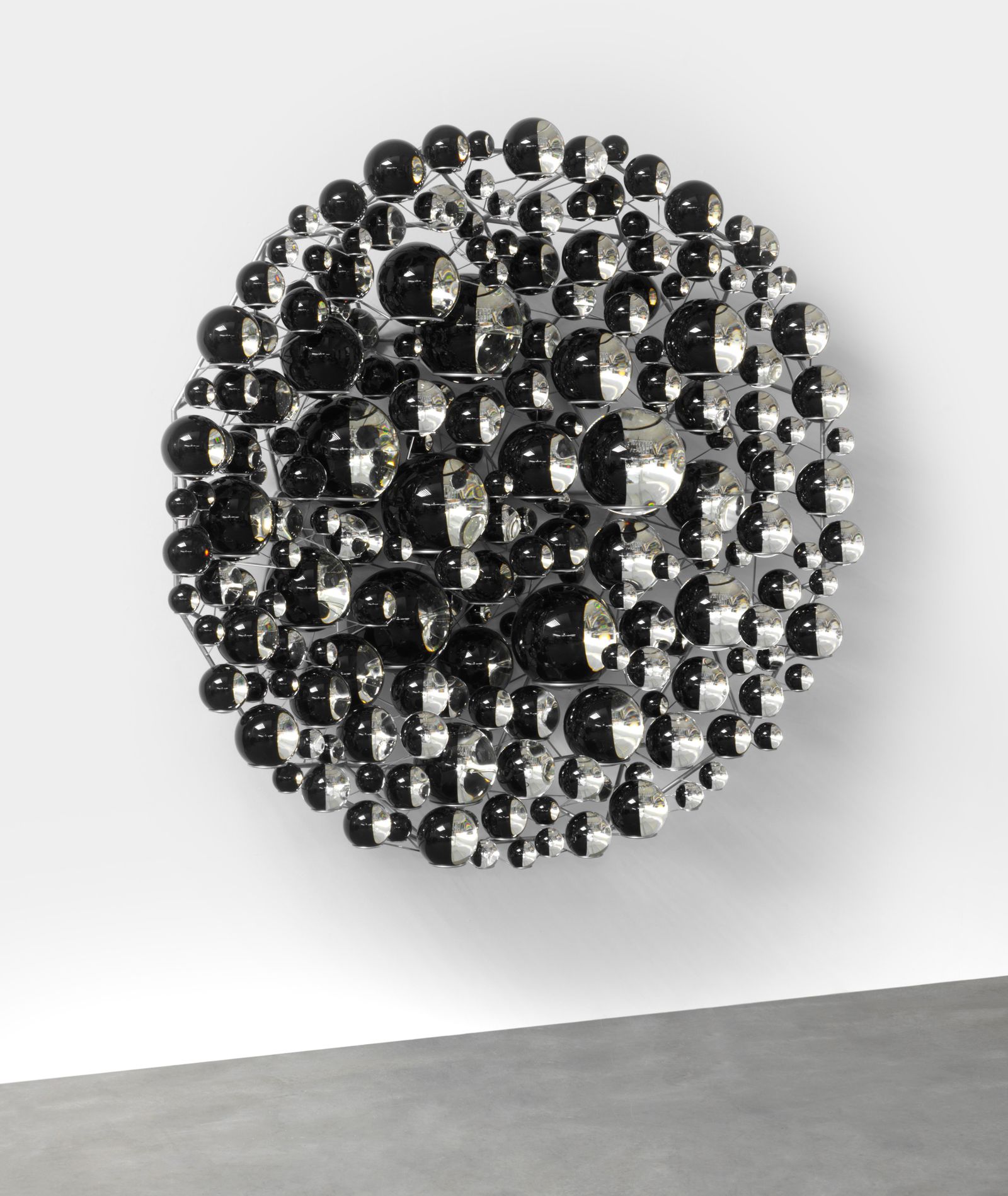 Olafur Eliasson’s sculpture, Dark matter collective, 2018, is comprised of a constellation of 217 partially silvered glass spheres of varying sizes, balancing in a wall-mounted, stainless-steel cradle to create a mesmeric circular mass of reflection. Each sphere has been hand-silvered and painted matte black. The work reveals itself through the viewer’s perception: as they move around the work of art, hundreds of inverted reflections of the viewer and the environment they inhabit are created. Dark matter collective continues Eliasson’s extended body of work in which spheres and reflective materials are used to cast experiences of wonder and altered perception.