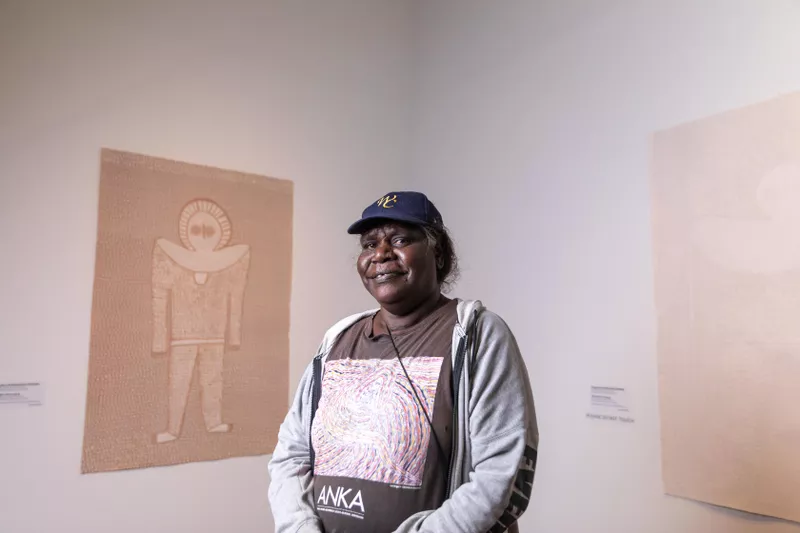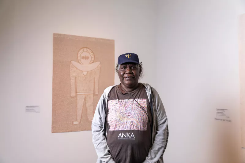 Angelina Karadada Boona with her work Wandjina Emerging, Tarnanthi 2021, Art Gallery of South Australia; photo: Sia Duff.