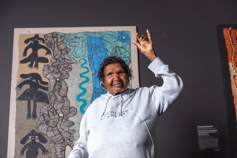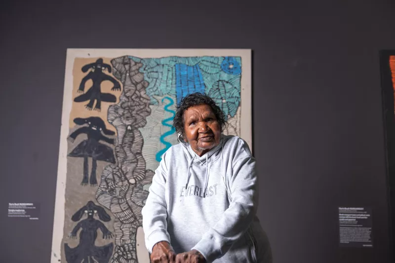 Doris Bush Nungarrayi with her work Kungka maṉkurrpa, Tarnanthi 2021, Art Gallery of South Australia, Adelaide; photo: Sia Duff.