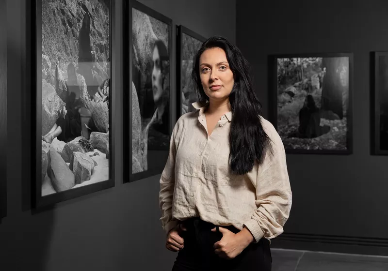 Hayley Millar Baker with her work I Will Survive, Ramsay Art Prize 2021, Art Gallery of South Australia, Adelaide; photo: Saul Steed.