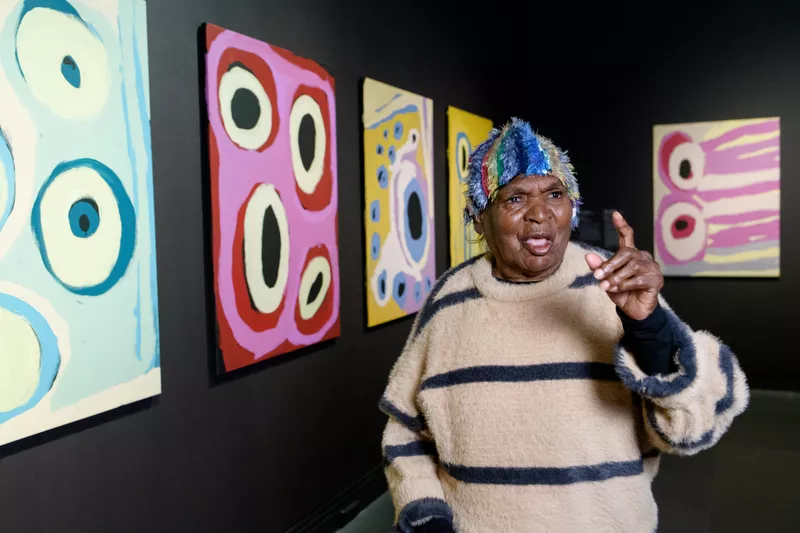 Katjarra Butler with her works Kitji Kitji & Wutjulu and Nikini & Lokuparra, Tarnanthi 2021, Art Gallery of South Australia, Adelaide; photo: Ben Searcy.