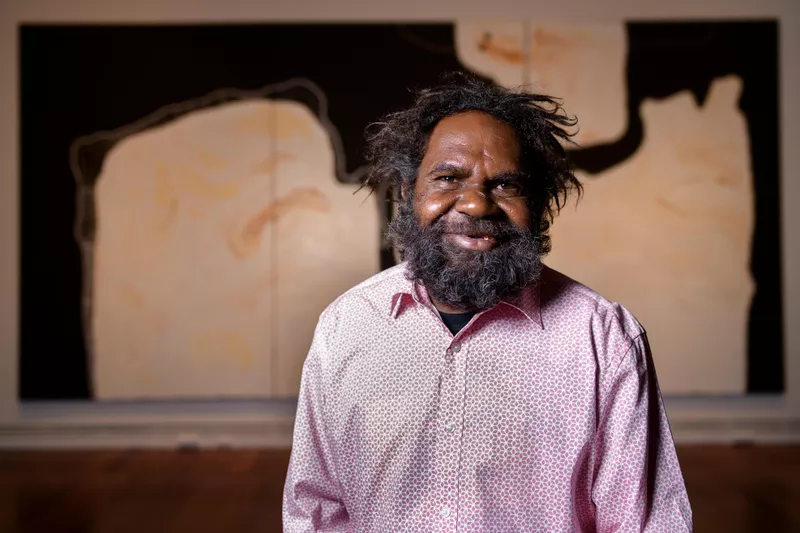 Timo Hogan with his work Lake Baker, Tarnanthi 2021, Art Gallery of South Australia, Adelaide; photo: Ben Searcy.