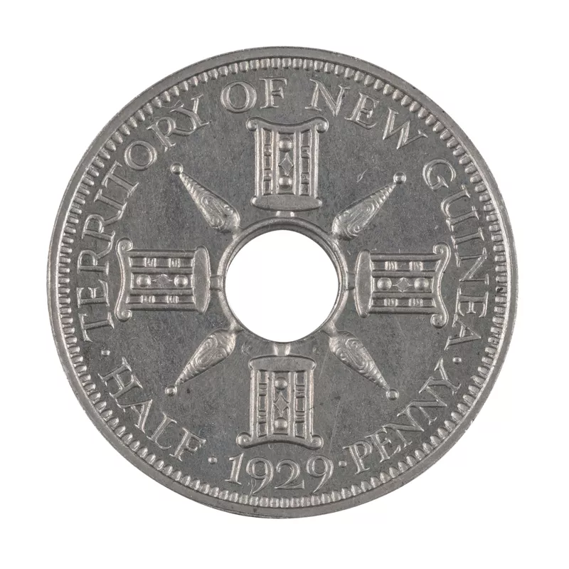 - Obverse: Crowned monogram with designs around hole. GEORGIVS V DG REX ET IND IMP 1/2. Reverse: Design around hole with lettering. Lettering: TERRITORY·OF·NEW·GUINEA ·HALF·1929· PENNY