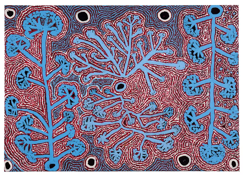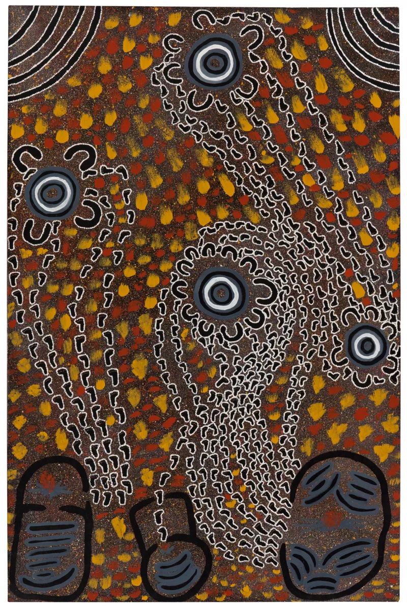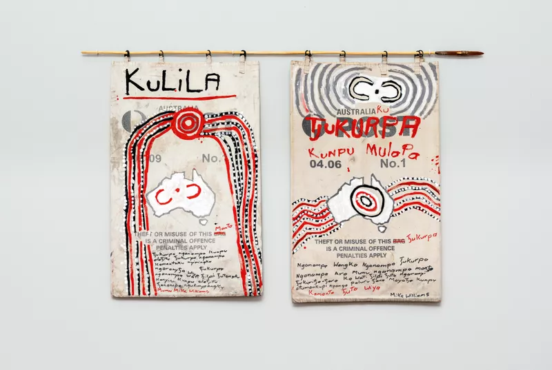 synthetic polymer paint on canvas mail bags; wood, spinifex resin and kangaroo tendonAccession no: 20173P62(a-c)On display, Gallery 10