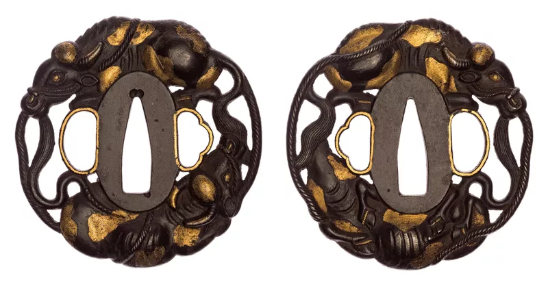Tsuba, two oxen joined by rope halters and linked by their tails
