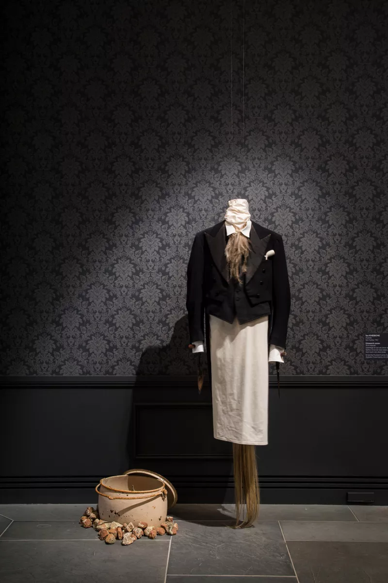2010assemblage of coat tails, dinner shirt, emu feathers, horse tail, metal shears, iron pot, skull, muslin, rams hornsAccession no: 20105S2(a-d) -
