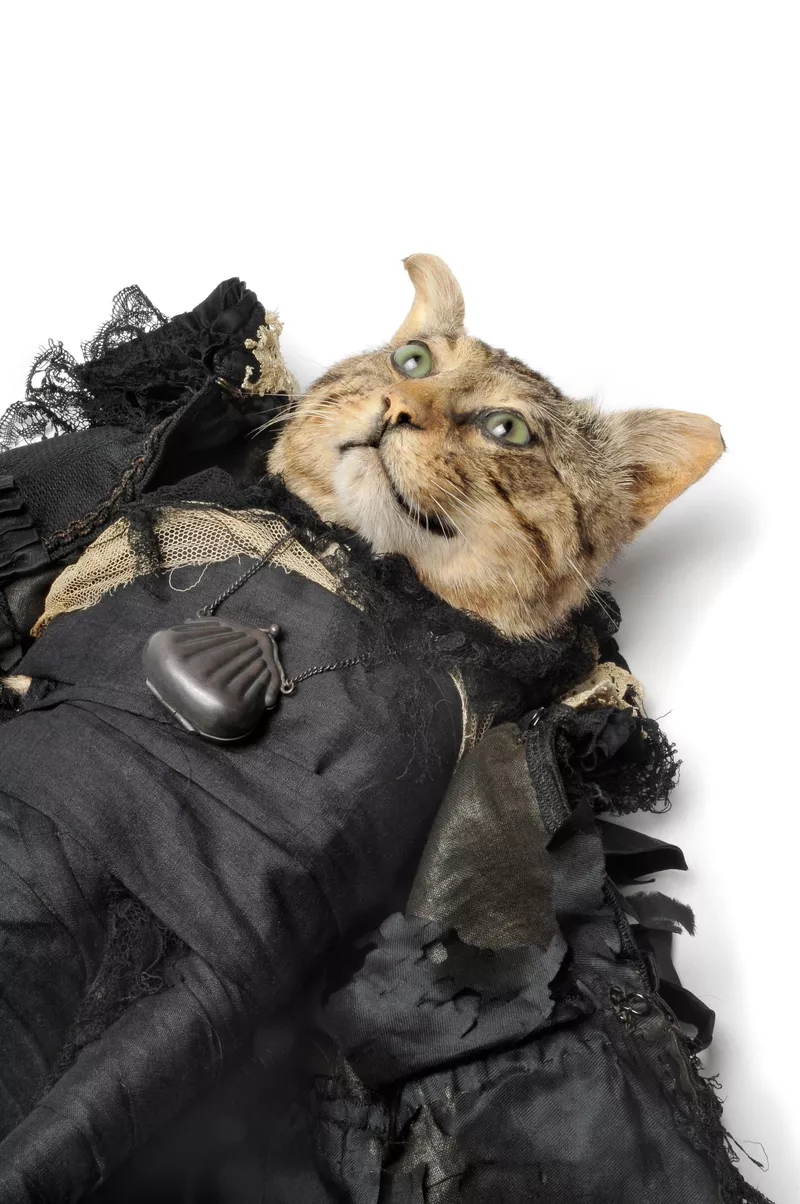 2012taxidermy cat, glass, linen, lace, silver, leather, woodAccession no: 20142A12A(a-c) -