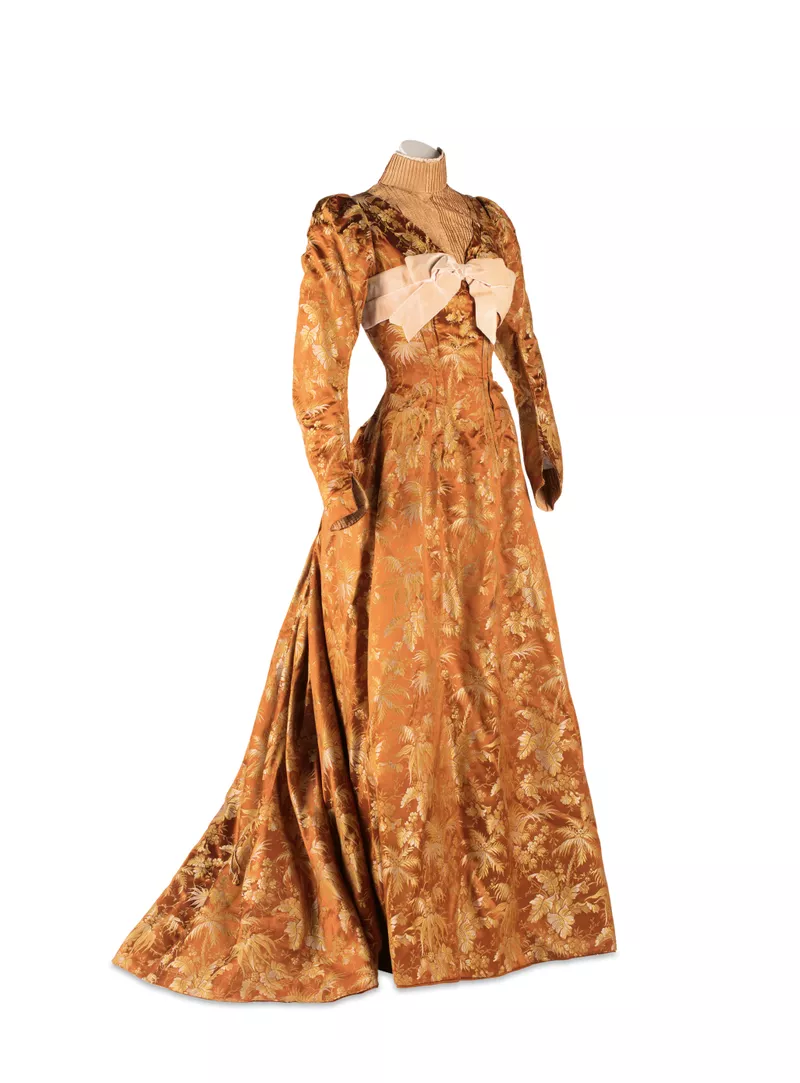 c.1890satin brocade, metal clasps, silk chiffon, silk velvet, feathers, silk satinAccession no: 733A8A(a-e) -