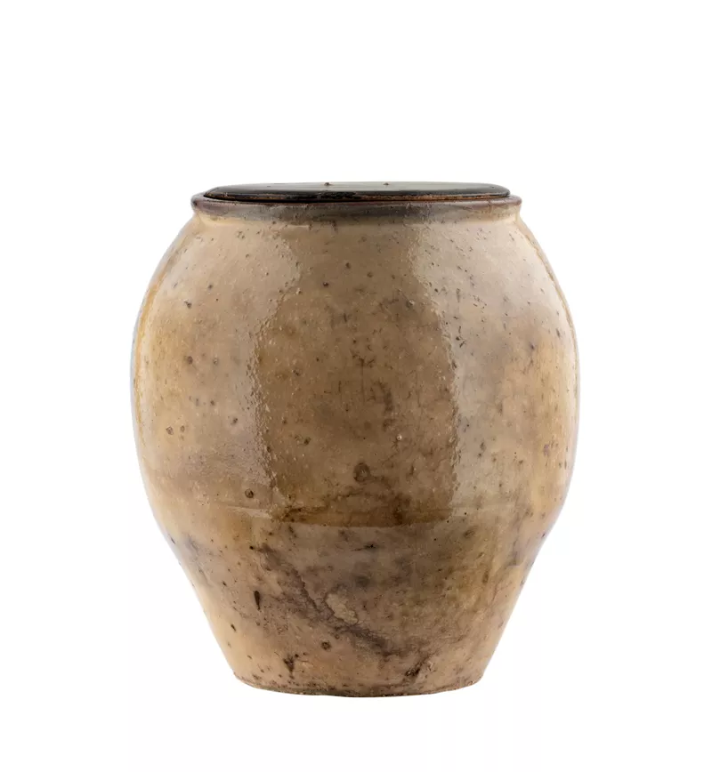 earthenware, yellow/green glaze, white and brown brushed decoration, wooden lidAccession no: 947C60(I&II)
