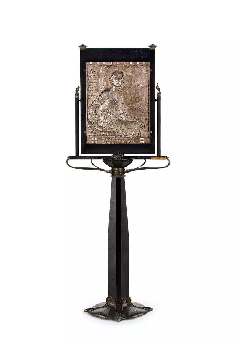 patinated silver electroplate on copper/lead alloy, mother-of-pearl, opal, garnet, painted oak (Quercus sp.)Accession no: F44On display, Gallery 18
