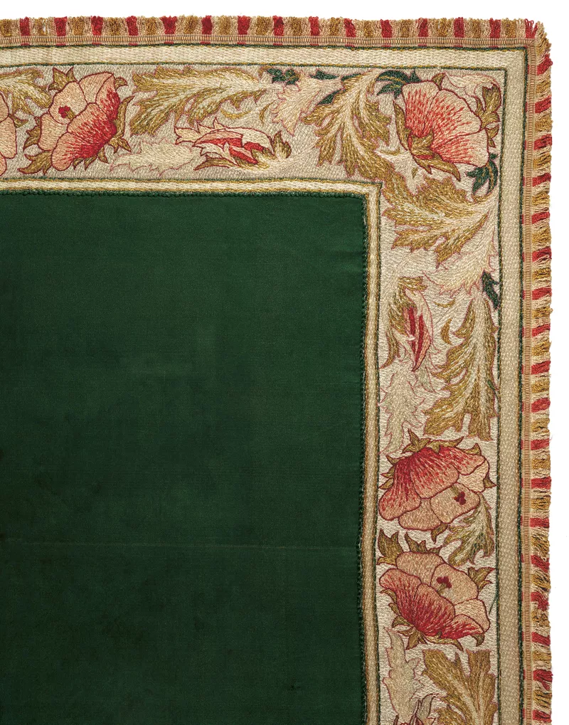 c.1900silk embroidery on linen, silk, silk fringeAccession no: 881A1A -