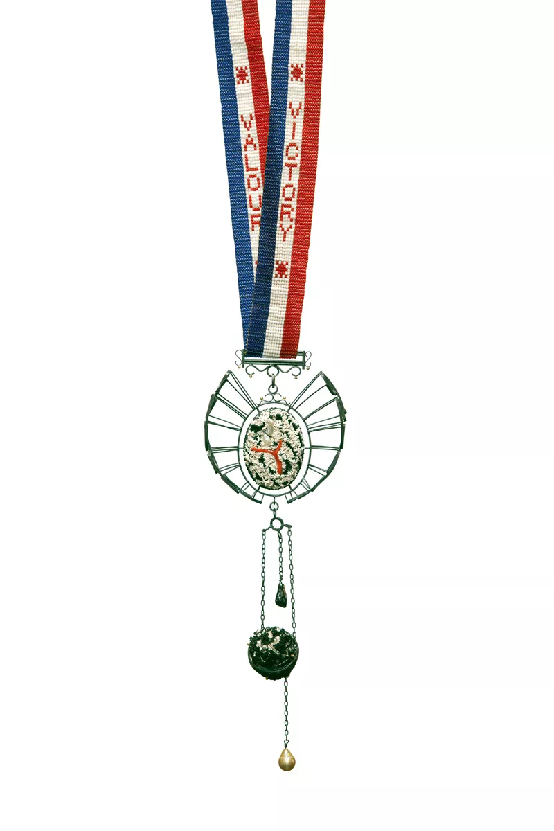 silver, gold, acrylic sealant, glass beads, thread, south sea and Akoya pearls, red coral on ribbonAccession no: 20063A33A