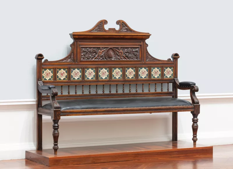 c.1885blackwood (Acacia melanoxylon), ceramic tiles, leather upholstery (replacement of original)Accession no: 869F10AOn display, Gallery 4 -