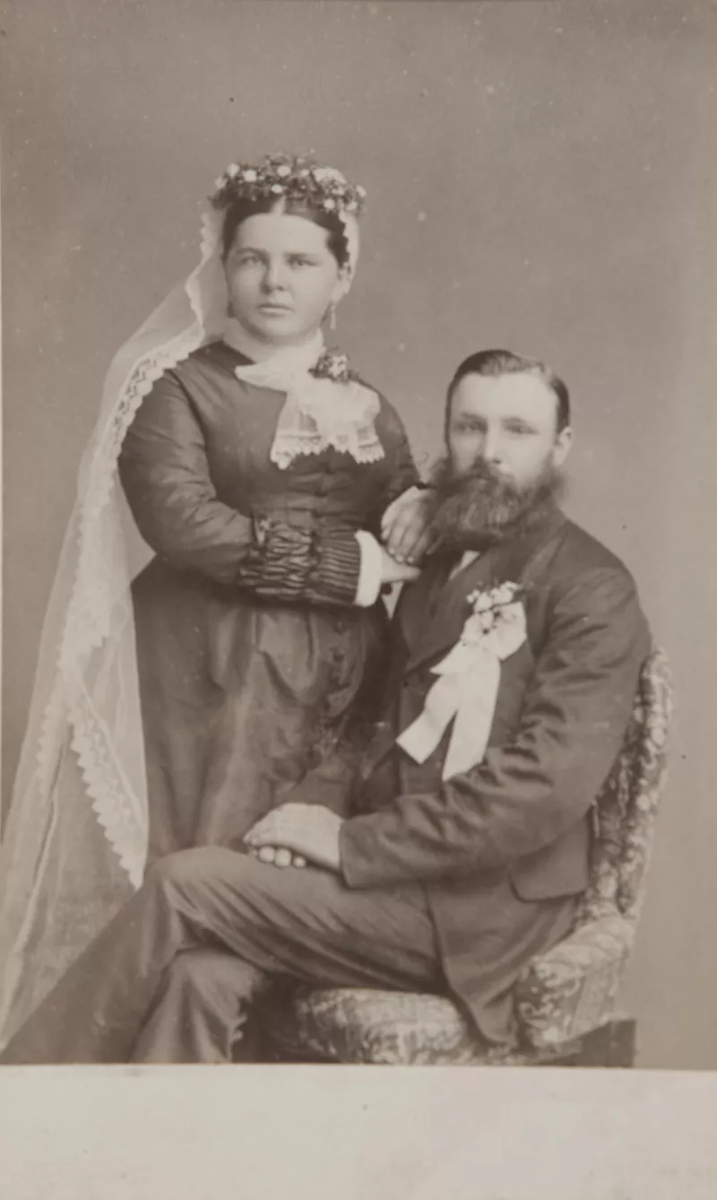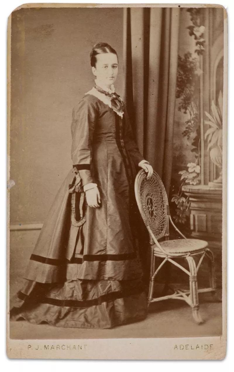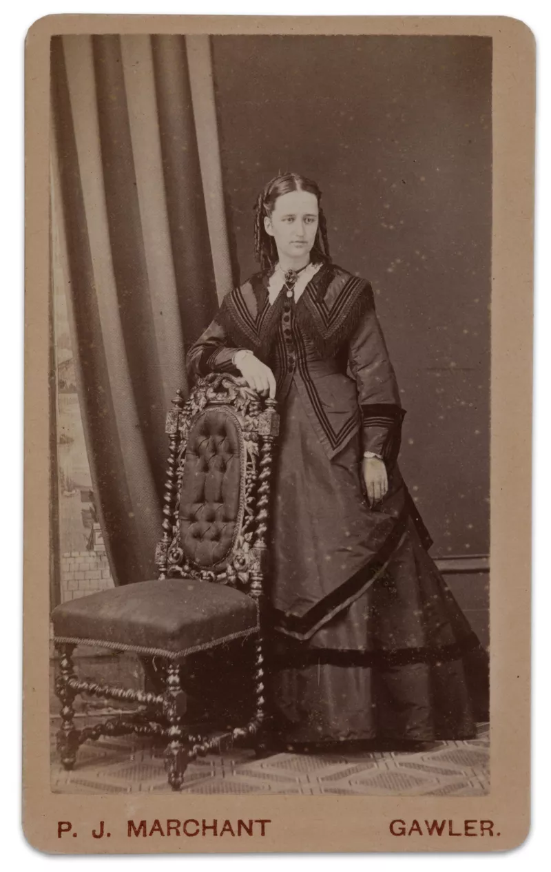Studio portrait of Mary Jane Dellow (nee Marchant) with arm resting on chair (aged about 20)