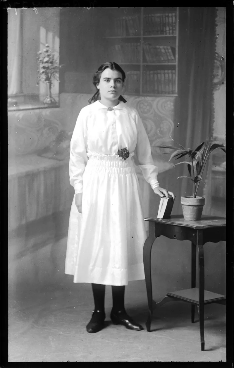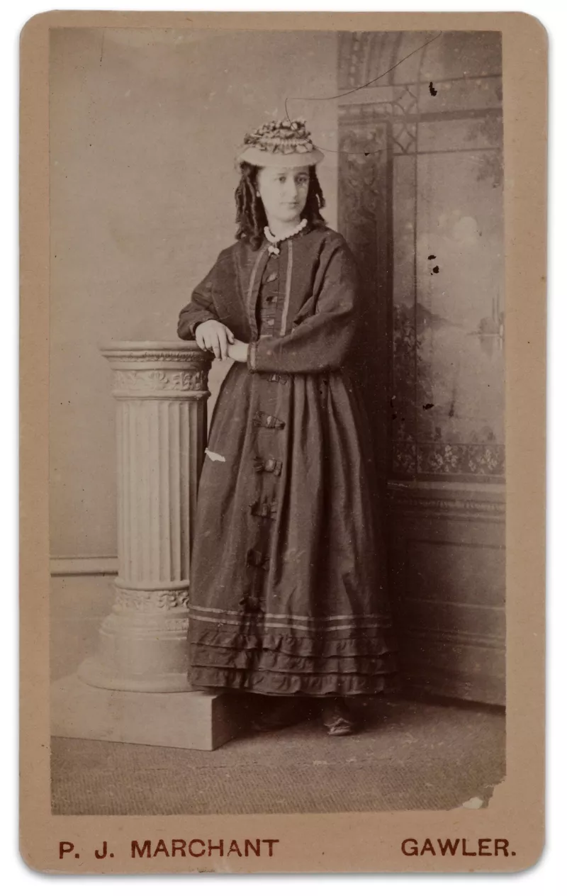 Studio portrait of Mary Jane Dellow (nee Marchant) with arm resting on pillar (aged about 16)
