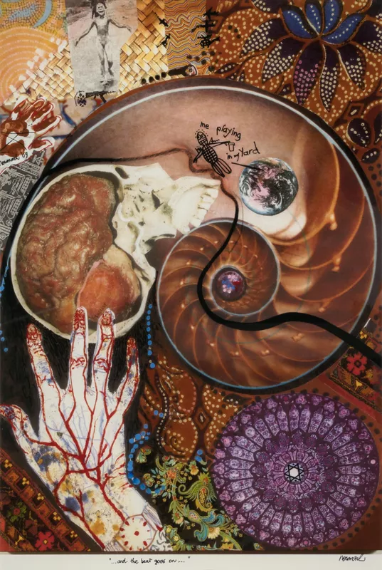 Ann Newmarch began the series Cultural pattern and human fragility (Pandora’s box) in 2008 after being diagnosed with cancer and completed the series while she was recovering. Her ill health and brush with mortality brought about a new way of working where she worked quickly and intuitively collaging together elements drawn from her years of collecting and thinking. As she said: “It’s haptic in a way – I know what the possibilities are but I don’t know the end result in advance. I have to trust myself to know what I am doing. It is both a rational response as well as an emotional one”. When you look beneath the patterning of the shapes and forms, many of the images reference war and also peace, media and found imagery, children’s drawings, remnants of fabric, aspects of her life and health, and lyrics from songs by John Lennon or Leonard Cohen. The small collages were enlarged as digital prints on canvas, and also on paper.