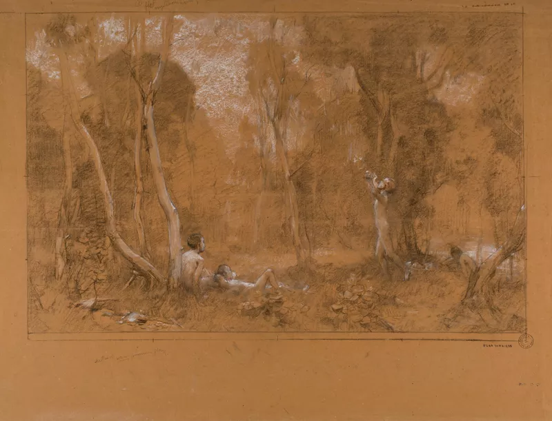 The subject of naked youths amongst saplings is rare in Heysen’s work. It is reminiscent of some of Corot’s paintings of bathers and partly recalls the work of Australian Art-nouveau artist Sydney Long. It may have been part of a search by Heysen for new subject matter and lead to his series of turkeys amongst saplings which he began around 1914.