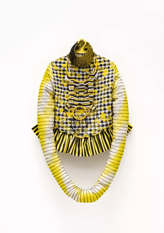 - mixed fabrics, quilting, wadding, plastic neck piece, plastic hanger