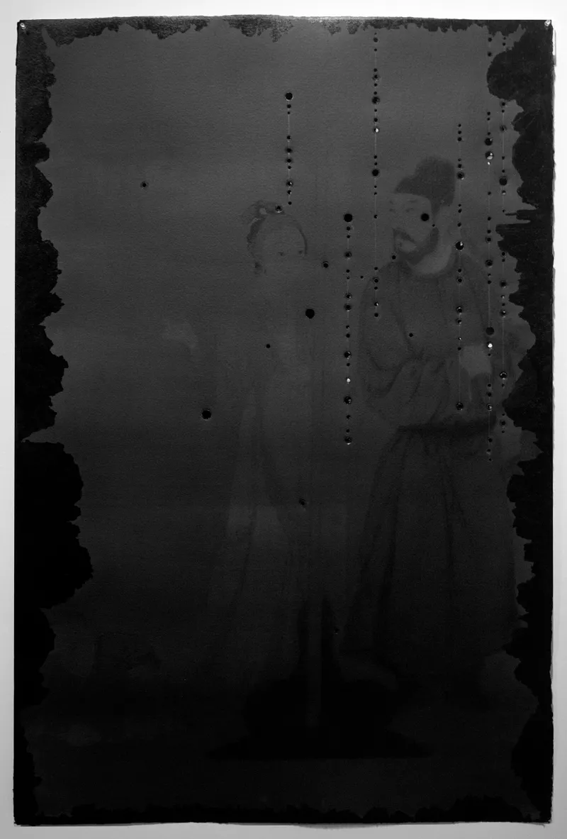inkjet print, Chinese ink, pencil, on black paper with puncture holes