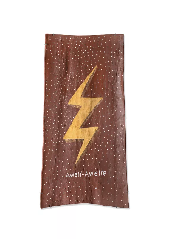 synthetic polymer paint, earth pigments on Stringybark (Eucalyptus tetrodonta)