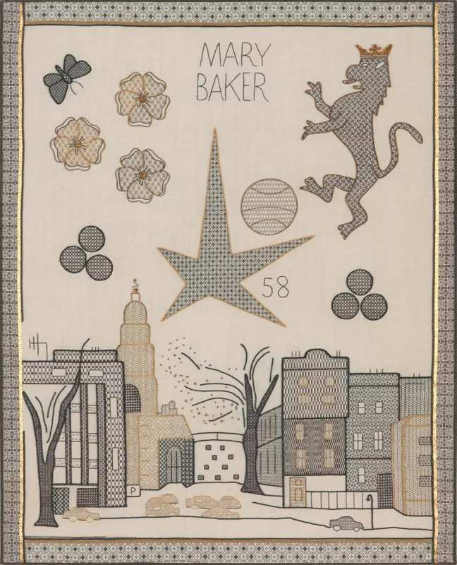 - Embroidery centre top; "MARY/ BAKER." Embroidered centre; "58"
