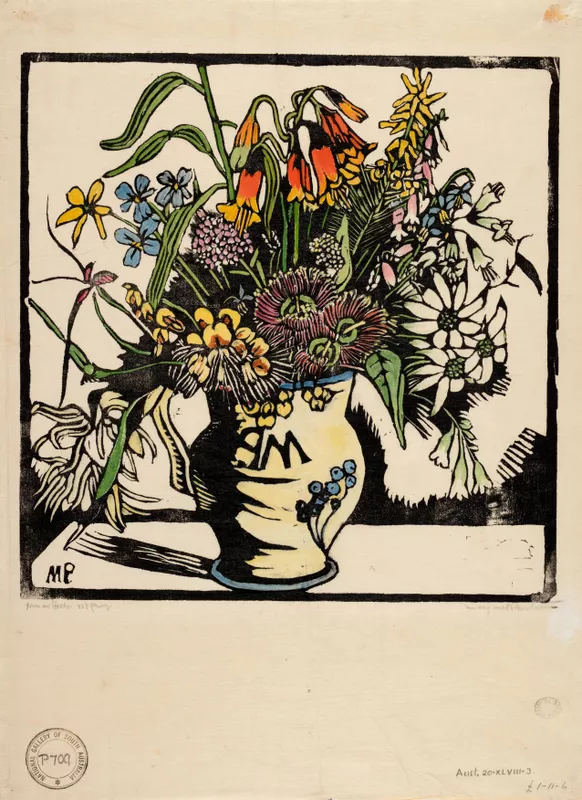 - Signed: printed in block, l.l., ink "M.P."; printed in block, bot.c., ink "MP [in reverse]"; in margin, l.r., pencil, "Margaret Preston". Not dated