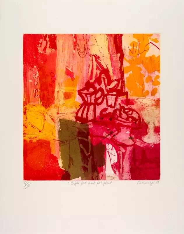 - etching, aquatint, printed in pink, red, orange, yellow, brown inks on paper
