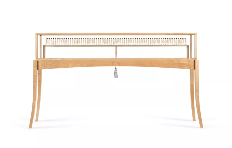 ink on paper, satin, cotton & viscose tassels, keys, glass, hock maple; cabinet by David Poulton