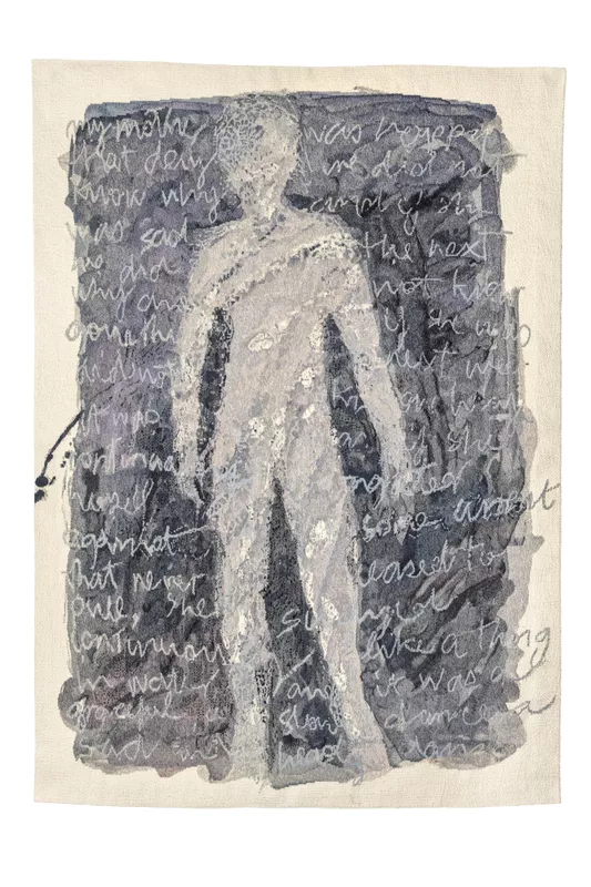 Lawrence’s works explore a range of themes, including gender, place and community, and this work, titled Daughter, is from a body of work produced by the artist in the 1990s investigating mother– daughter relationships. Deriving from a drawing executed by Lawrence of her daughter Ellie, in the tapestry the image is transformed into a much more general figure, which looms life-size through a background of text.