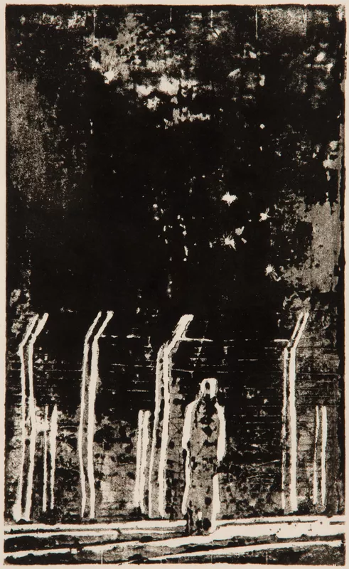 Created with rudimentary materials in an internment camp, this woodcut depicts a lone figure looking through the barbed wire fence into a black abyss of nothingness. In this unevenly inked impression, the constellation of the Southern Cross can just be discerned in the sky.