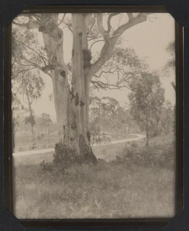 Eucalypt, with horse-pulled dray behind