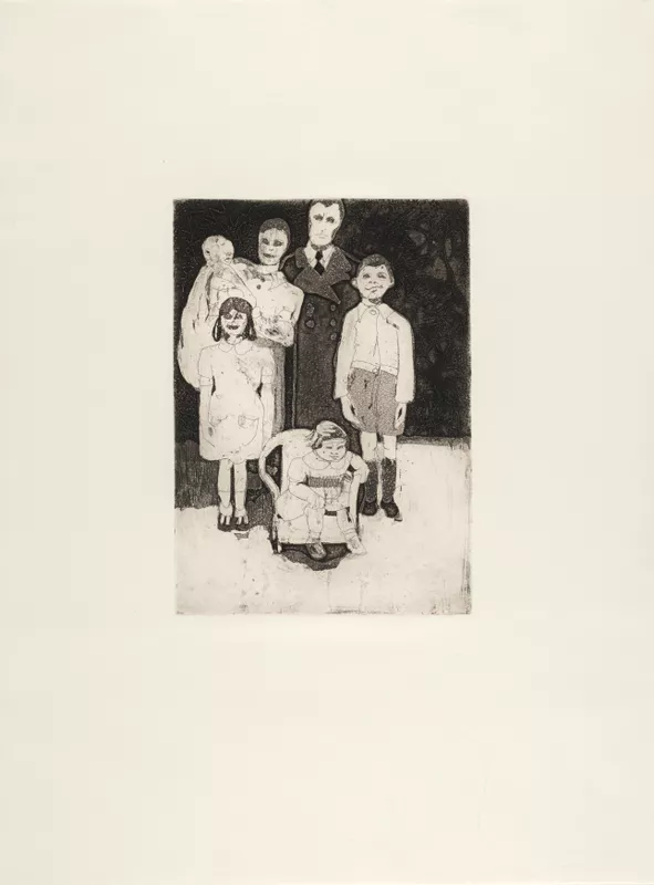 Ann Newmarch studied teaching at Western Teacher’s College, Adelaide, 1964-68, and the course’s practical art subjects were taught through the South Australian School of Art, where she was introduced to printmaking techniques. She made several etchings at this time, which address the theme of family and domestic situations. This work is based on an old family snapshot – Ann is seated on the little chair, her sister Barbra and her brother are standing, and her mother holds Ann’s little sister. Later in the 1970s Newmarch again returned to the theme of family, at that time from the perspective of a mother observing her own children.