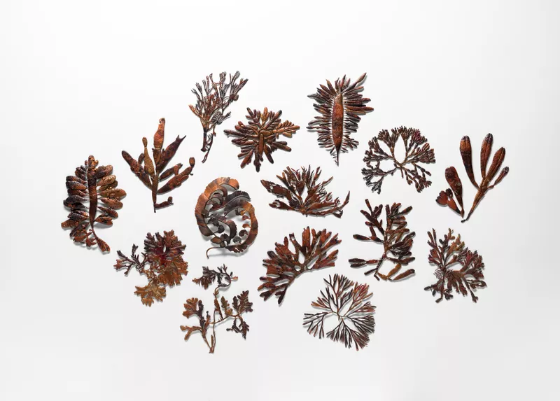 flowers of the sea, 2022 by Julie Blyfield investigates the shapes, forms and textures of red sea weeds found along the southern coast of Australia. Seaweeds and other marine algae are integral to the health of the planet, producing large quanitites of the oxygen we breath and play an important part in marine and land ecology. Red seaweed specimens are found in a range of different shapes and forms, much like the plant diversity found on the earth's surface. Like the rest of the natural world, red sea weed is under threat due to human-induced climate change. These often over-looked ocean species are the focal point for flowers of the sea. In this ambitious work, Blyfield has created 15 objects that draw on the traditions of natural history illustration and the documnetation of marine specimens. Through thorough investigation of red seaweed specimens found in the collection of the State Herbarium of South Australia- the artist has created objects in bi-metal copper fused with sterling silver that reference the delicate fronds, blades and stems of this extensive collection. The application torch heating and plunging the objects into boiling water has allowed the artist to produce a vivid pallet of reds and coppers in the 15 objects, much like the range of colours found in red seaweeds. Each object has been sealed with archival wax to protect the surface while also providing a low sheen to the metal, creating an almost 'wet' look. flowers of the sea, draws attention this this important marine species and showcases the artist's decades long interest in the representation of Australian plant specimens in metalwork.